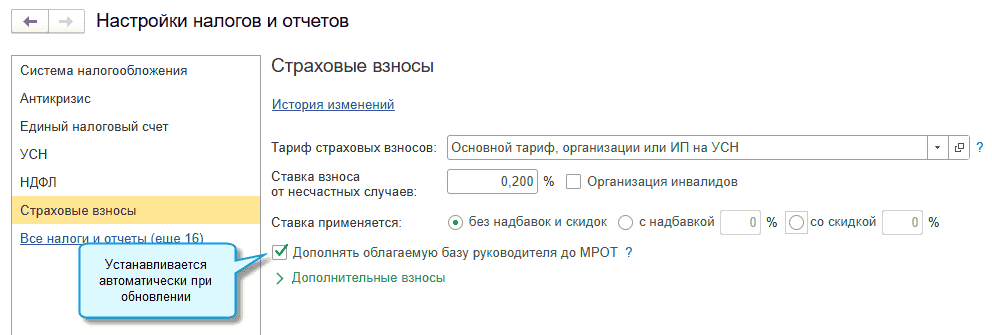 Полный интерфейс: меню "Главное - Настройки - Налоги и отчеты - Страховые взносы".