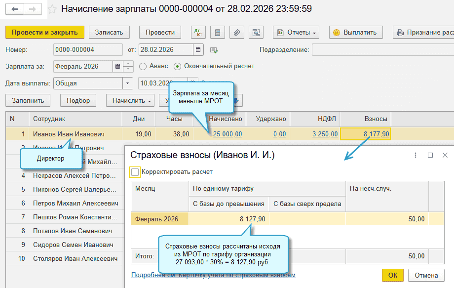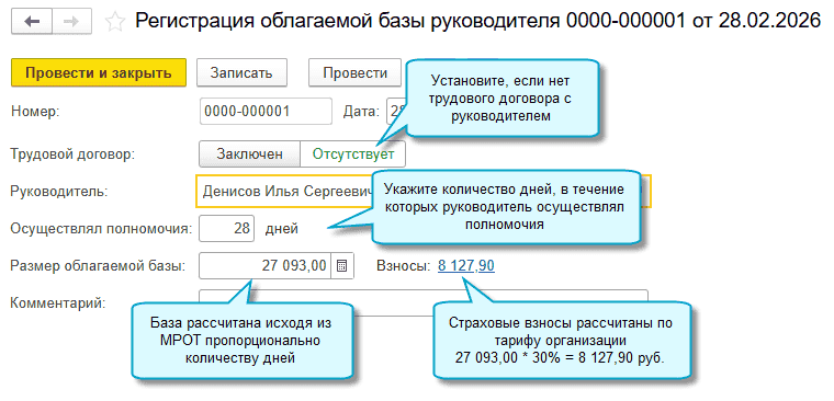 Если же с директором заключен трудовой договор и его оклад больше 0 руб., то страховые взносы автоматически доначислятся при проведении документа "Начисление зарплаты" за месяц.