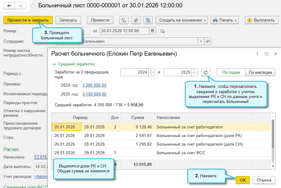 Если с начала 2026 года уже оплачивались больничные листы и доход сотрудника не превышает 2,4 млн. рублей, НДФЛ рассчитывается по ставке 13%, то можно внести следующие корректировки только по больничным листам и ведомостям, по которым они оплачены.