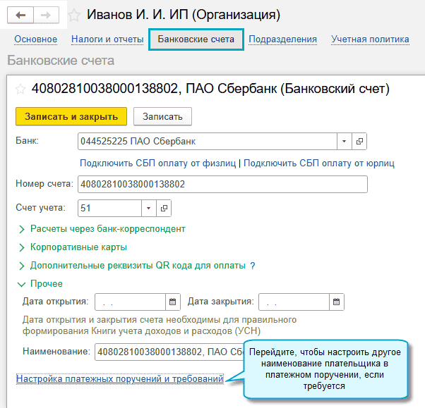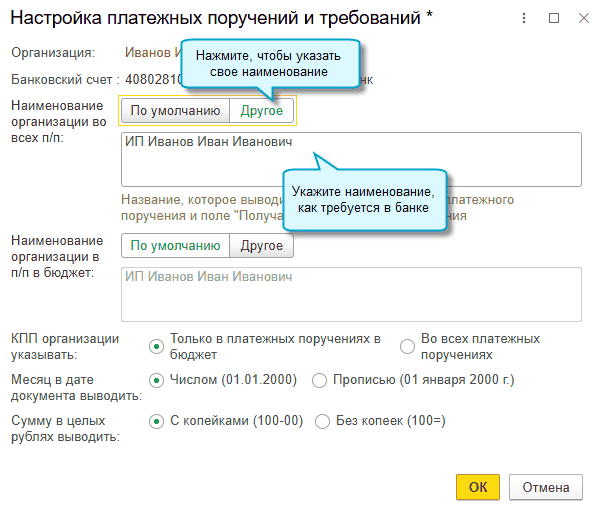 Если в вашем банке другие требования по оформлению платежных поручений, то настройте наименование плательщика в платежных поручениях.