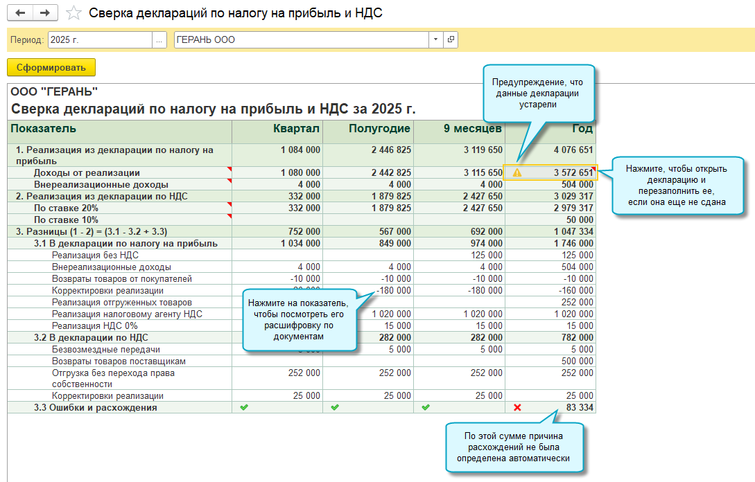 Добавлен отчет по сверке деклараций по налогу на прибыль и НДС. Используйте его для самопроверки при подготовке отчетности и при ответе на требование ФНС по расхождениям между декларациями.