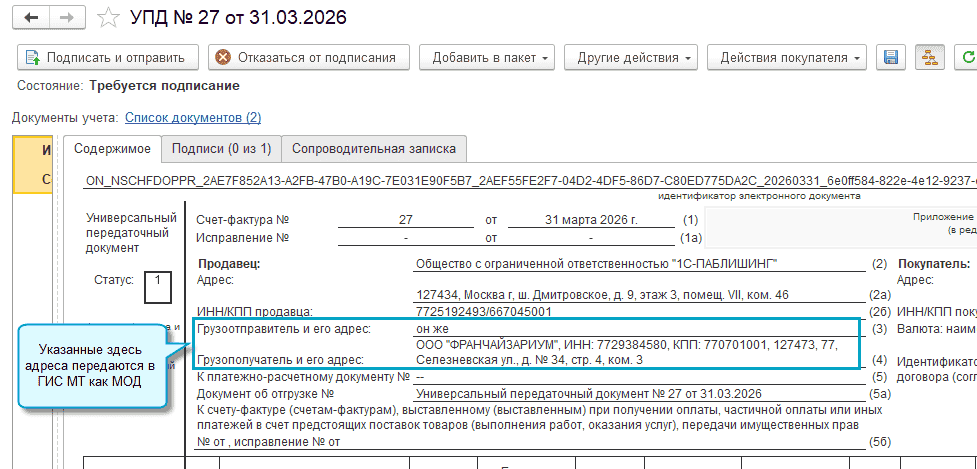 При отгрузке сторонним организациям необходимо, чтобы был найден МОД получателя. Предусмотрена возможность перед отправкой электронного документа выполнить проверку на соответствие указанных адресов требованиям ГИС МТ. Проверка выполняется по ссылке "Ожидается проверка в ГИС МТ", которая отображается в нижней части документа, рядом со ссылкой, отражающей статус ЭДО. Если в результате проверки по указанному адресу МОД в ГИС МТ не найден, будет отображена ссылка "Не найден МОД контрагента", перейдя по ней можно сопоставить адрес с активными доступными МОД по данной товарной группе в ГИС МТ. После выполнения сопоставления в электронной документ будет подставляться ФИАС идентификатор корректного МОДа получателя. После успешной проверки на соответствие требованиям ГИС МТ отображается ссылка "Проверен в ГИС МТ".
