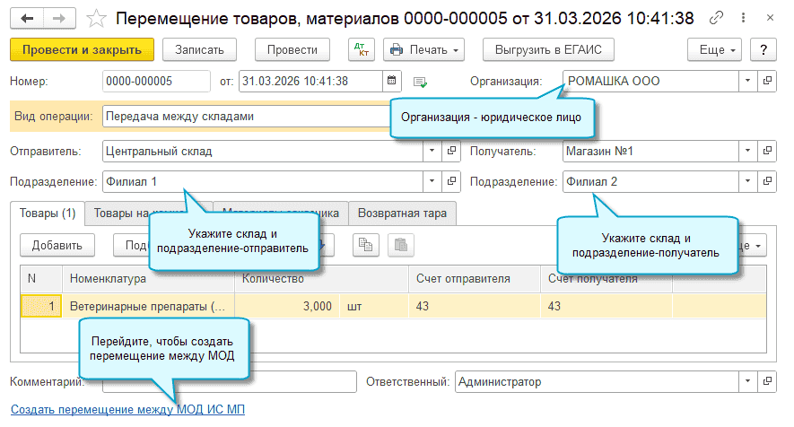 Если организация - юридическое лицо, то при перемещении между МОД потребуется указать склад и подразделение-отправитель и склад и подразделение-получатель. Адреса складов должны быть зарегистрированы как МОД в ГИС МТ "Честный знак".