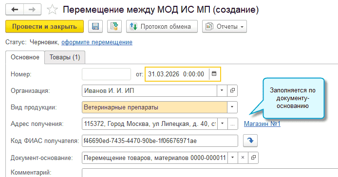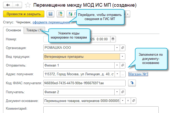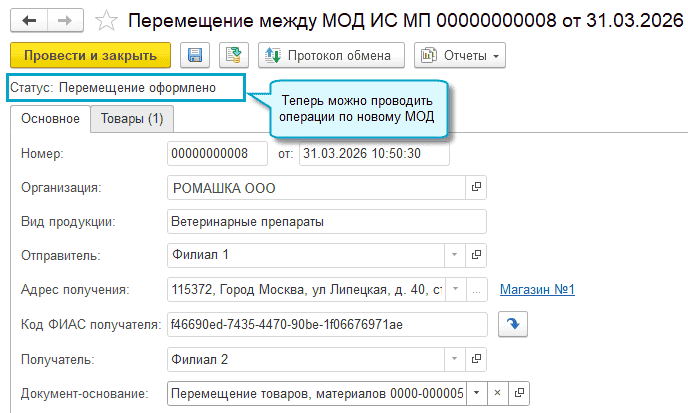 Поддержана передача в ГИС МТ сведений о перемещении ветеринарных препаратов между местами осуществления деятельности (МОД) при продаже и при перемещении внутри организации.