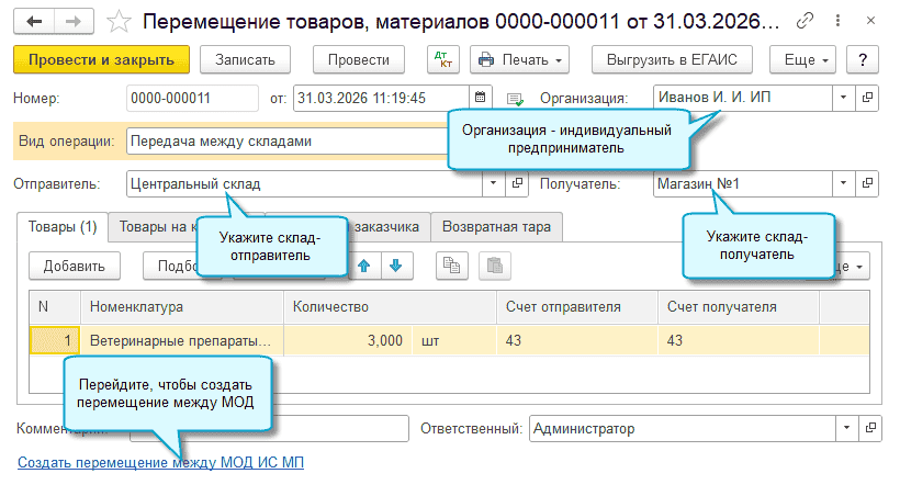 Если организация - индивидуальный предприниматель, то при перемещении между МОД потребуется указать склады. Адреса складов должны быть зарегистрированы как МОД в ГИС МТ "Честный знак".