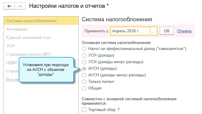 Полный интерфейс: меню "Главное - Настройки - Налоги и отчеты - Система налогообложения".