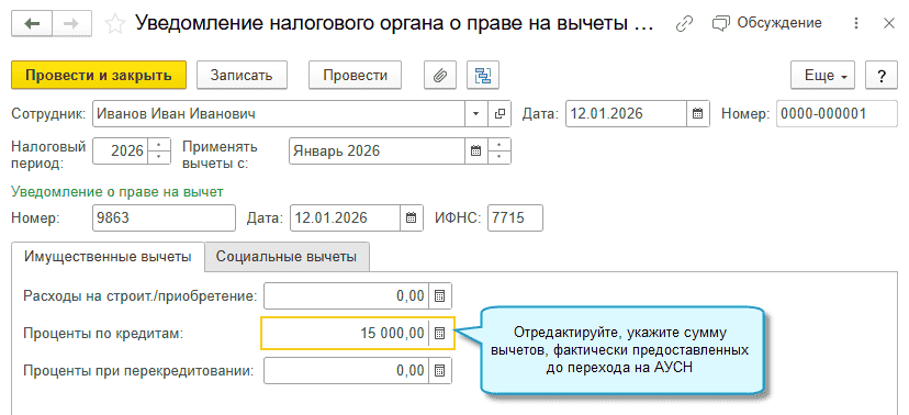 Полный интерфейс: меню "Зарплата и кадры - НДФЛ - Все документы по НДФЛ - Уведомление налогового органа о праве на вычеты".