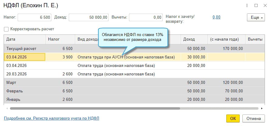При применении АУСН НДФЛ теперь рассчитывается по ставке 13 % независимо от размера дохода сотрудника, отдельно по каждой выплачиваемой сумме, а не нарастающим итогом с начала года. Так, как если бы этот расчет выполнял уполномоченный банк (статья 17 Федерального закона от 25.02.2022 № 17-ФЗ).