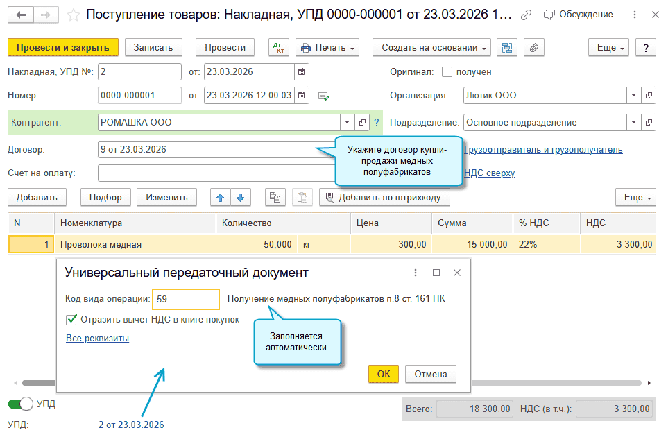 Добавлена возможность автозаполнения кодов операций НДС для книги продаж и книги покупок при реализации медных полуфабрикатов (Письмо ФНС России от 16.01.2026 № СД-36-3/185@). Если производится корректировка реализации или поступления, то в корректировочных счета-фактурах (УКД) код потребуется указать вручную. Подробнее о кодах см. здесь.