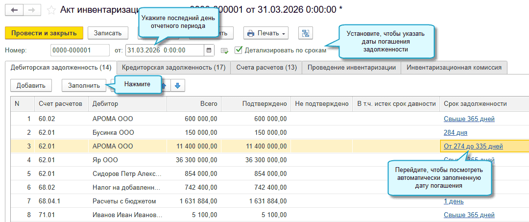 Классификация задолженности по срокам осуществляется на основании дат погашения, указанных в документе Акт инвентаризации расчетов.