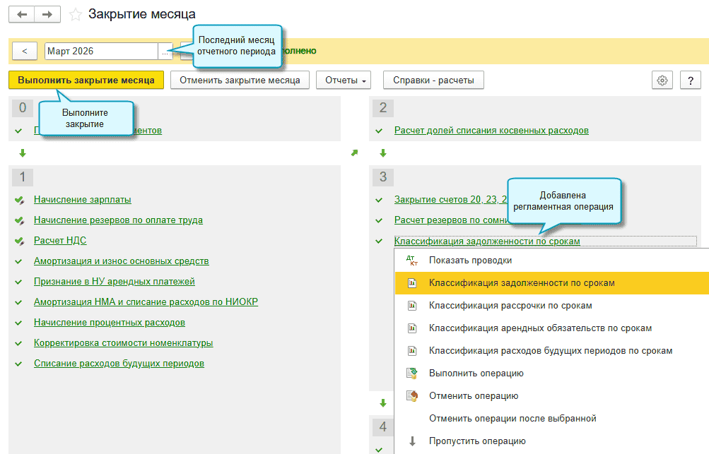 Полный интерфейс: меню "Операции - Закрытие периода - Закрытие месяца - Классификация задолженности по срокам".