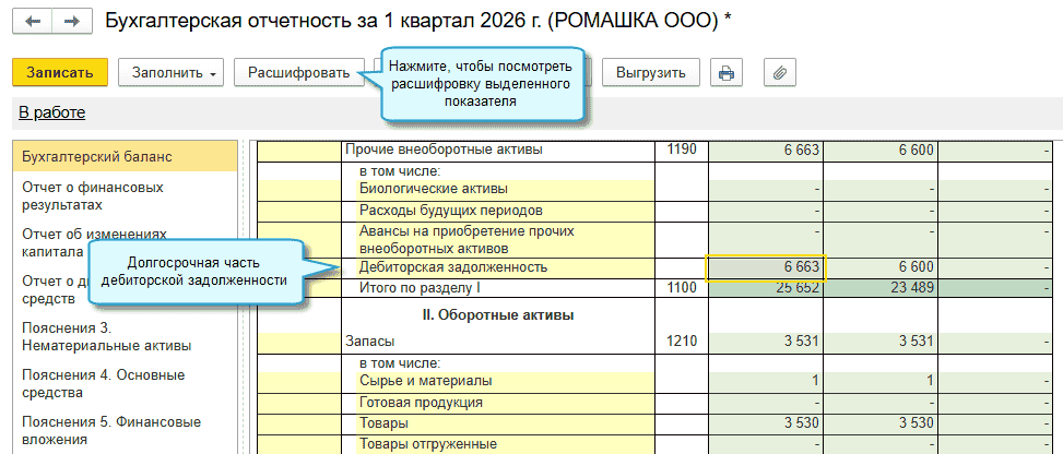 Добавлена возможность заполнить бухгалтерский баланс с разделением задолженности на долгосрочную и краткосрочную.