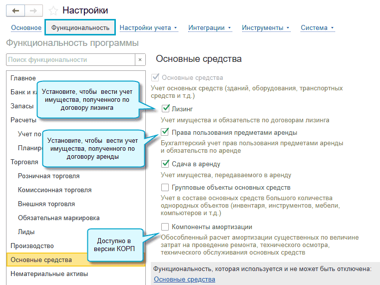 Добавлена возможность вести учет аренды и лизинга имущества по ФСБУ 25/2018 «Бухгалтерский учет аренды» для арендатора и лизингополучателя. Доступен вариант учета без дисконтирования арендных (лизинговых) платежей.