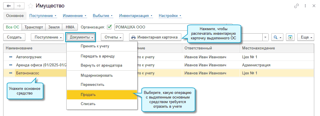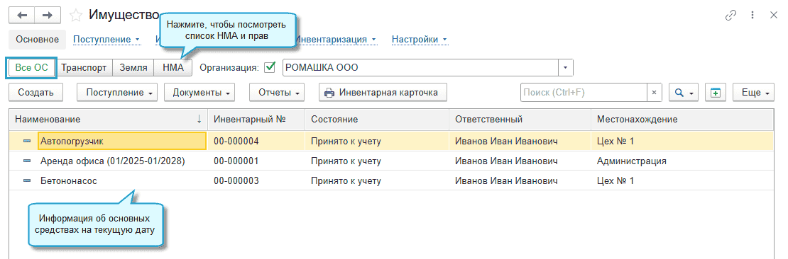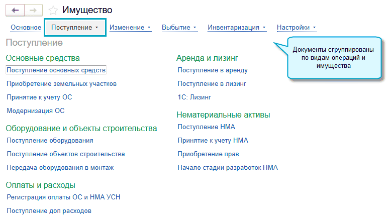 В результате раздел "Основные средства" переименован в "Имущество". И теперь в нем располагаются документы по отражению операций с основными средствами и НМА, аренды и лизинга.