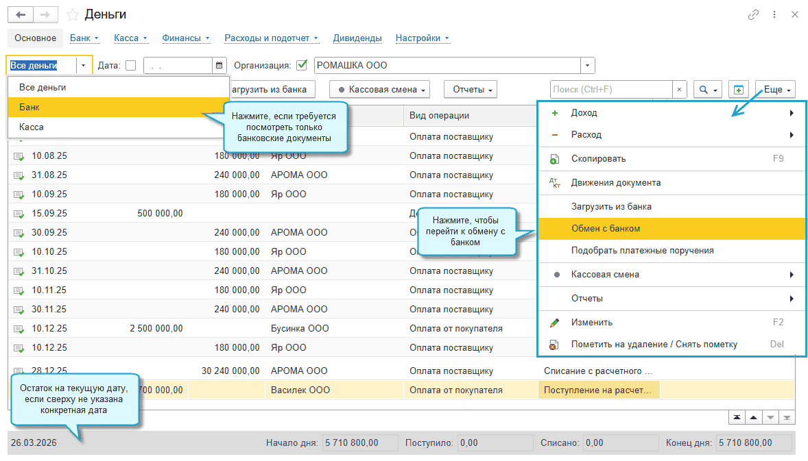 На основной странице раздела "Деньги" общий список документов теперь можно смотреть отдельно по банку и кассе, на заданную дату. В подраздел "Настройки" добавлены настройки, связанные с отражением операций по банку и кассе.