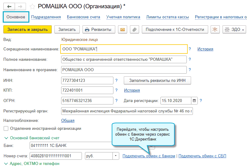 Ссылка на помощник подключения к сервису 1С:ДиректБанк теперь располагается около банковского счета в карточке организации, если с банком доступен обмен через 1С:ДиректБанк.