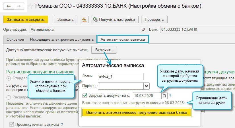 При первоначальном включении можно указать дату, начиная с которой требуется загрузить выписки.