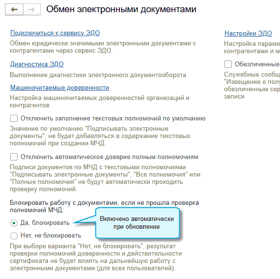 Добавлена возможность настроить - блокировать или нет работу с электронными документами, если МЧД и ее подпись не прошли проверку. Подробнее ...