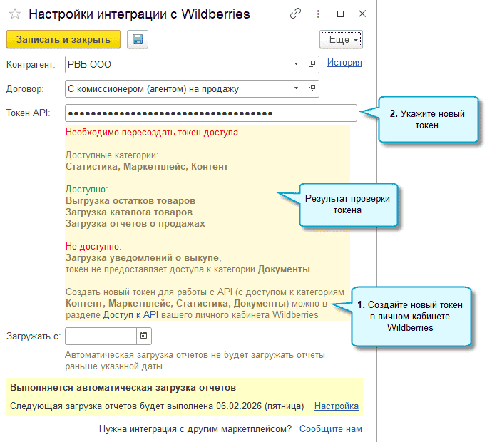 Теперь анализируется токен API, указанный в настройках интеграции с Wildberries. Проверяется срок действия, доступность действий (загрузка отчетов о продажах, выгрузка остатков, загрузка уведомлений о выкупе и др.), корректность токена.