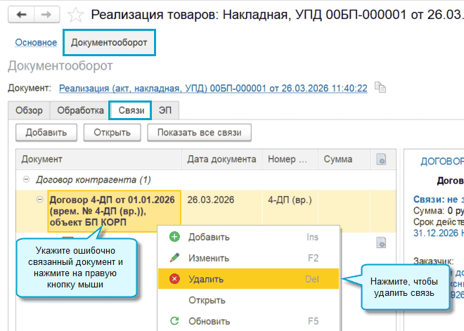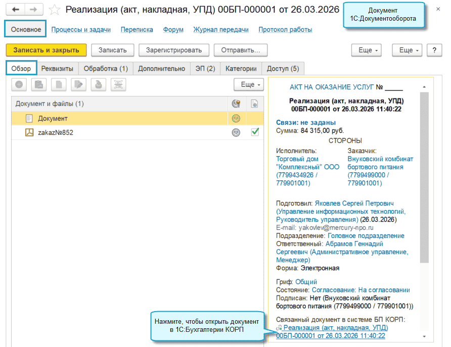 Из документа 1С:Документооборота теперь можно открыть связанный с ним документ 1С:Бухгалтерии предприятия КОРП.