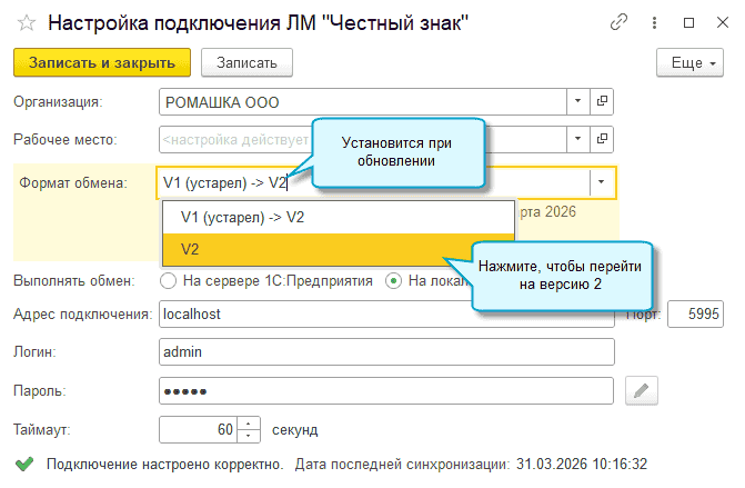 При обновлении по всем имевшимся настройкам подключения ЛМ ЧЗ устанавливается единственно возможный ранее формат обмена V1.