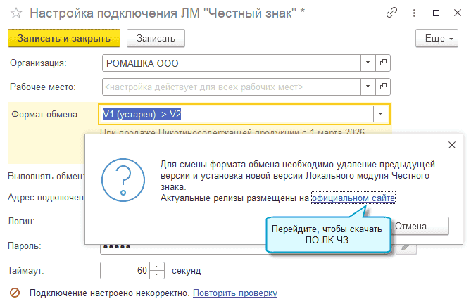 Для перехода с формата V1 на формат V2 необходимо удалить старую версию ПО ЛМ ЧЗ и установить новую версию. Перед скачиваем новой версии ПО ЛМ ЧЗ узнайте, поддерживает ли кассовое ПО работу с версией 2, при необходимости обновите.