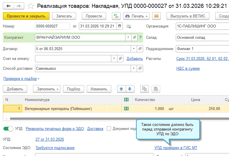 С 01.03.2026 вступили в силу требования Постановления Правительства РФ от 27.05.2024 № 675 по отслеживанию перемещения продукции товарной группы Ветеринарные препараты между филиалами или складами одной организации и при отгрузке сторонним организациям. Также начал действовать поэкземплярный учет при оптовых продажах.