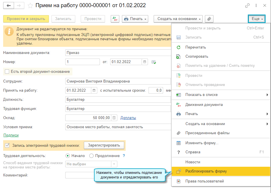 Добавлена возможность редактировать кадровые документы, подписанные и переданные в сервис 1С:Кабинет сотрудника. Для этого документ следует разблокировать, отредактировать, повторно подписать и передать в сервис. Документ вновь поступит сотруднику на подпись в его кабинет.