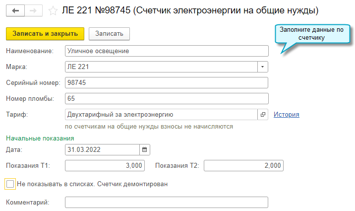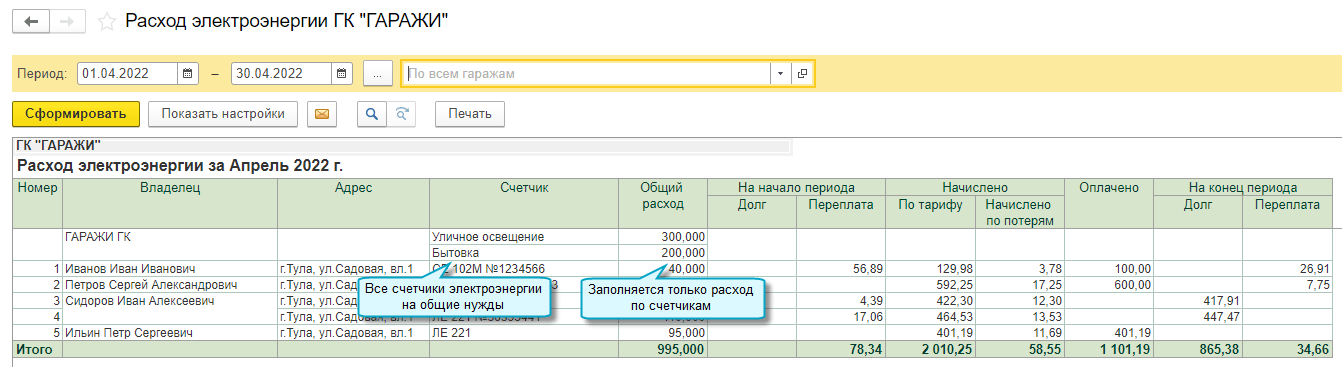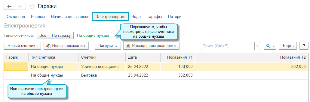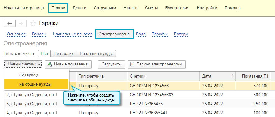 Добавлена возможность вести учет показаний счетчиков электроэнергии и воды на общие нужды ГСК (уличное освещение, обслуживание автомойки и др.).