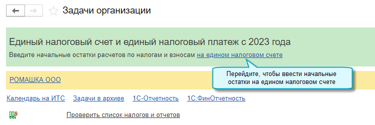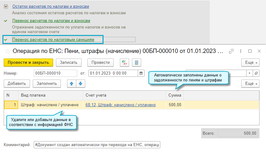 Добавлена возможность автоматического ввода начального остатка на едином налоговом счете. Остатки задолженности и переплаты по налогам и взносам на 31.12.2022 списываются на счет 68.90 "Единый налоговый счет".