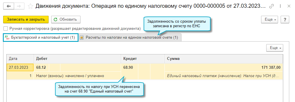 Остаток по счету 68.90 "Единый налоговый счет" должен соответствовать сальдо ЕНС по данным ФНС. Может потребоваться ручная корректировка сумм, заполненных автоматически.