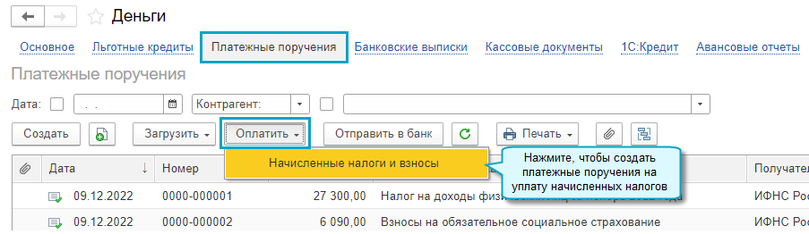 Отдельные платежные поручения формируются в задачах по расчету или уплате конкретных налогов.