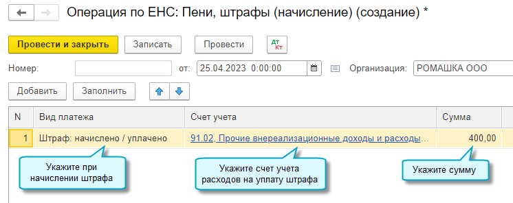 Используйте документ Операция по ЕНС с видом операции Пени, штрафы (начисление) для отражения в учете пеней и штрафов, уплаченных за счет ЕНП.