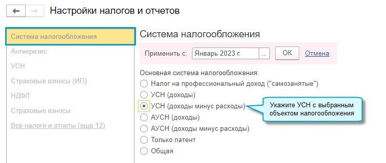 Простой интерфейс: меню "Настройки - Настройка налогов и отчетов - Система налогообложения".