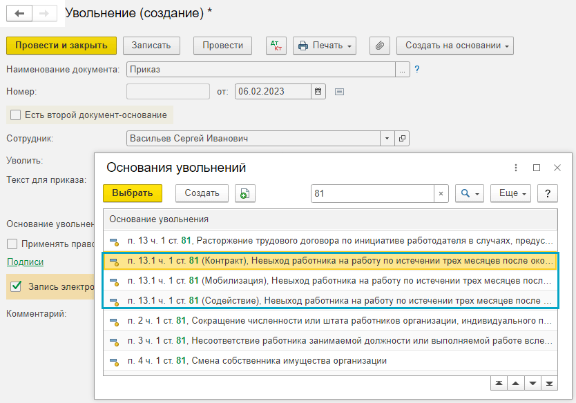 Добавлены основания увольнения в связи с мобилизацией сотрудников и руководителей (Федеральный закон от 07.10.2022 № 376-ФЗ, Федеральный закон от 04.11.2022 № 434-ФЗ).