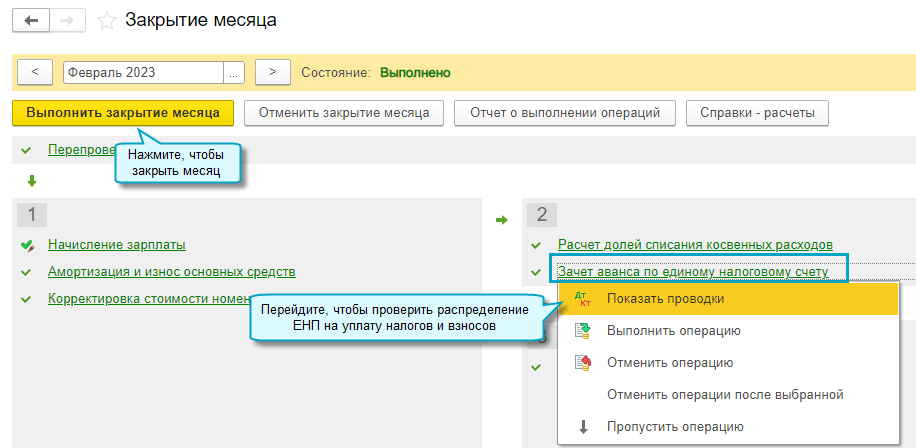 Зачет ЕНП выполняется регламентной операцией при закрытии месяца при условии наличия средств на едином налоговом счете, по сроку уплаты - 28 число месяца, следующего за отчетным.