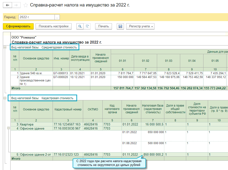Расчет налога на имущество выполняется отдельно по имуществу, облагаемому по среднегодовой и по кадастровой стоимости.