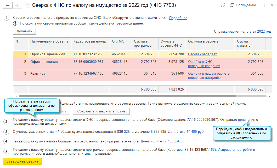 Сверка по налогу на имущество выполняется аналогично сверке расчетов по транспортному и земельному налогам.
