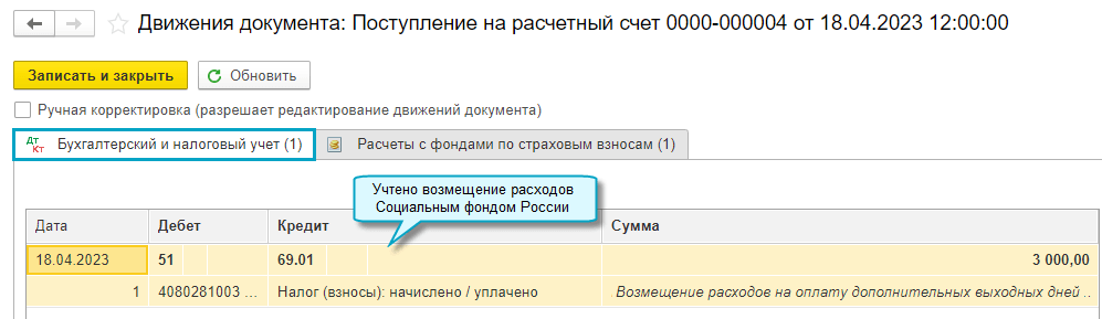 Добавлена возможность учитывать поступление из Социального фонда России возмещения расходов на оплату дополнительных выходных дней для ухода за детьми-инвалидами, на выплату пособия на погребение, на финансирование предупредительных мер по сокращению производственного травматизма и других расходов.
