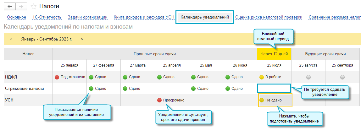 Простой интерфейс: меню "Налоги - Календарь уведомлений".