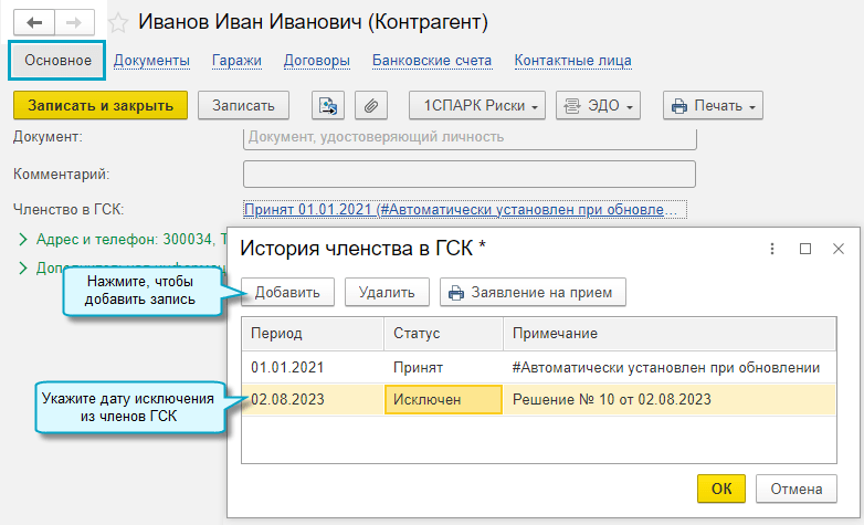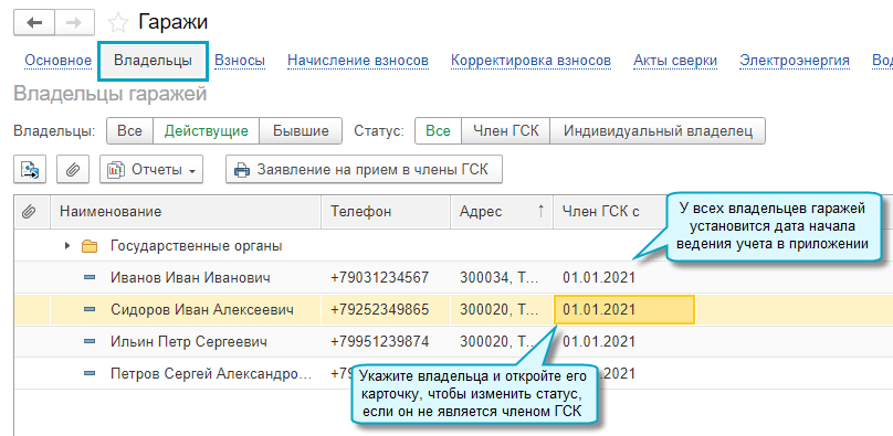 Добавлена возможность вести историю членства в ГСК. Для этого владельцы гаражей разделяются на членов ГСК и индивидуальных владельцев, не являющихся членами ГСК.