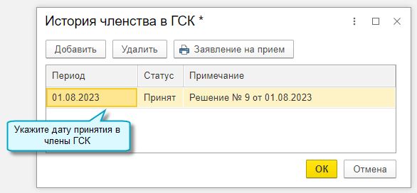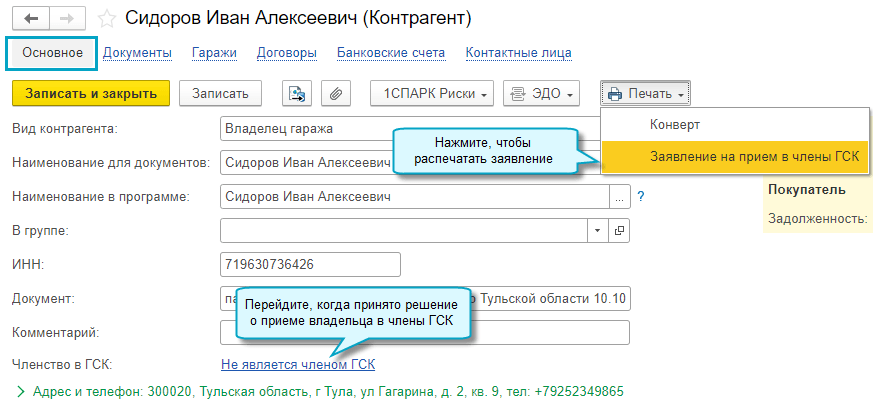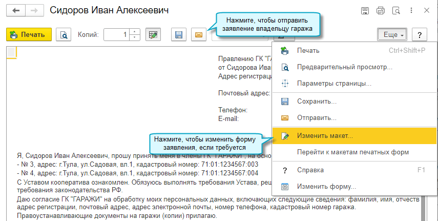 Также добавлена возможность подготовить и распечатать заявление на вступление в члены ГСК.
