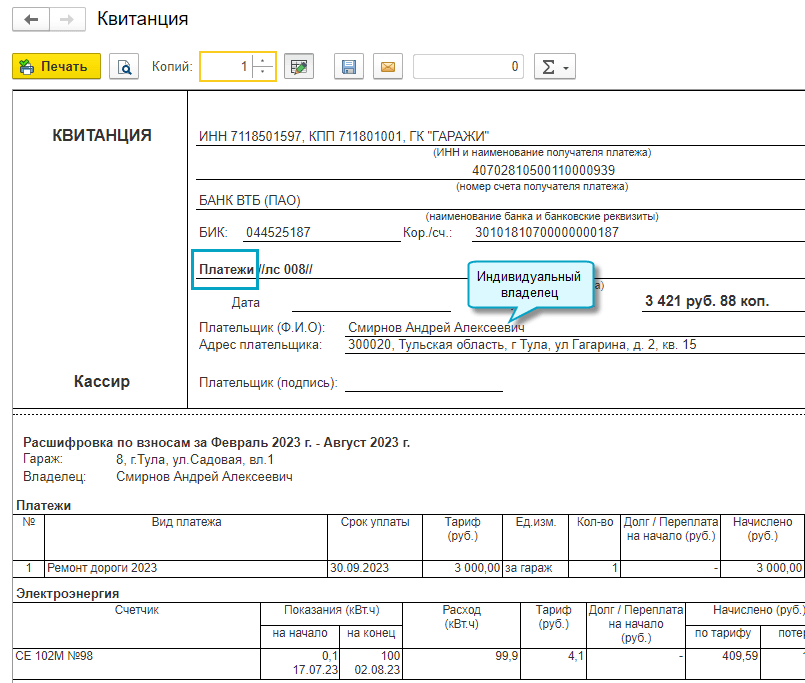 В квитанции на оплату индивидуальным владельцам в наименовании платежа печатается "Платежи...", членам ГСК - "Взносы...".