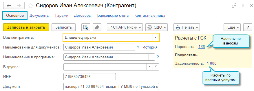Добавлена информация о сумме задолженности и переплате в карточку владельца гаража. Отдельно - по расчетам с ГСК по взносам и по платным услугам.