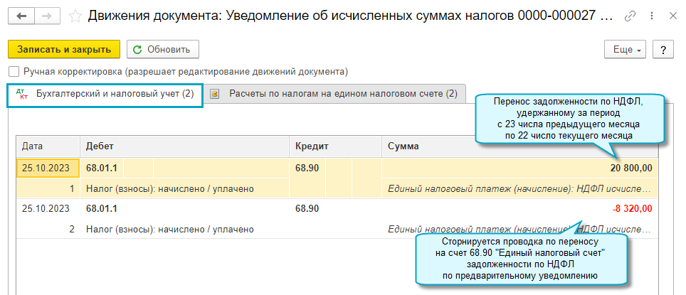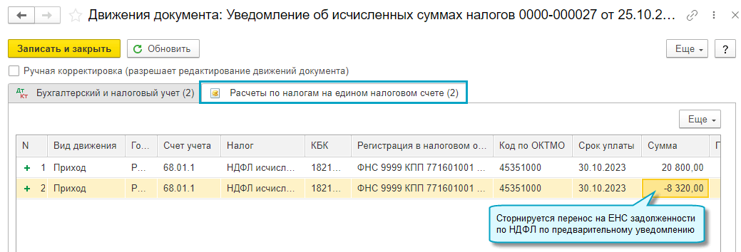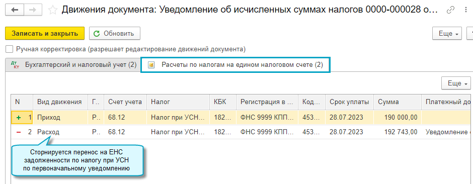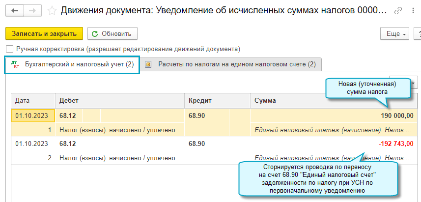 С 01.10.2023 при подготовке повторного уведомления об исчисленных суммах налогов с новой суммой налога автоматически корректируется задолженность по счету 68.90 "Единый налоговый счет" и в регистре по ЕНС.