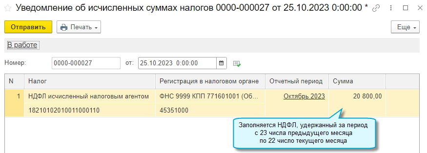 Добавлена возможность подготовить уведомление об исчисленных суммах налогов на НДФЛ, удержанный за период с 23 числа предыдущего месяца по 9 число текущего месяца. Такие промежуточные уведомления можно в добровольном порядке отправлять в ФНС с 1 октября 2023 г. по 31 декабря 2023 г. (Федеральный закон от 31.07.2023 № 389-ФЗ).