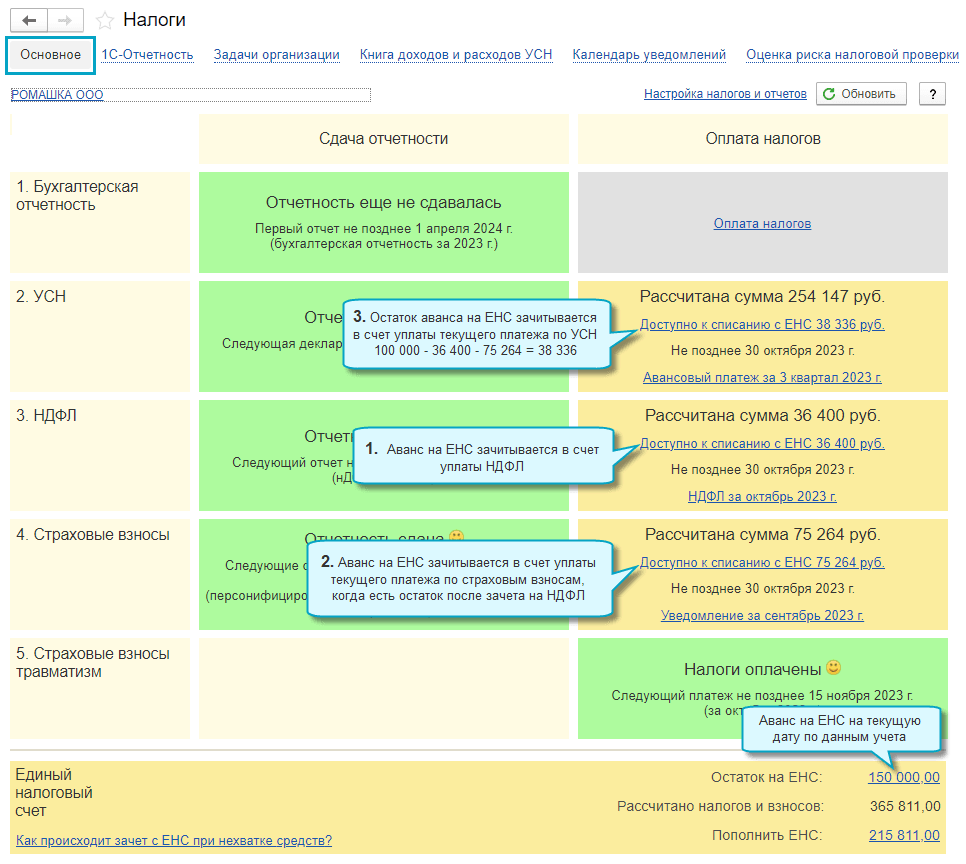 В Мониторе налогов и отчетности аванс на ЕНС теперь распределяется между налогами с учетом очередности, установленной редакцией Налогового кодекса РФ на 01.10.2023 (Федеральный закон от 31.07.2023 № 389-ФЗ).