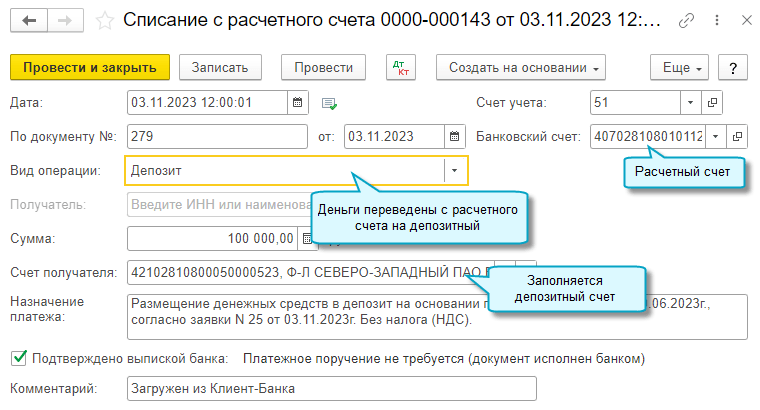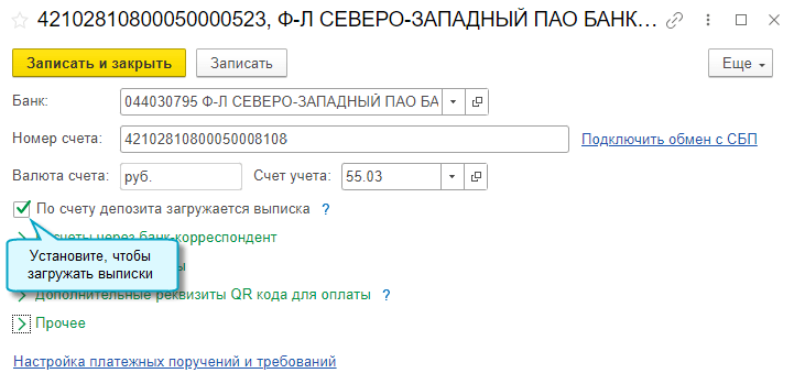 Если учет депозитов ведется по номерам депозитных счетов, то требуется загружать банковские выписки и по расчетному счету, и по депозитному счету.