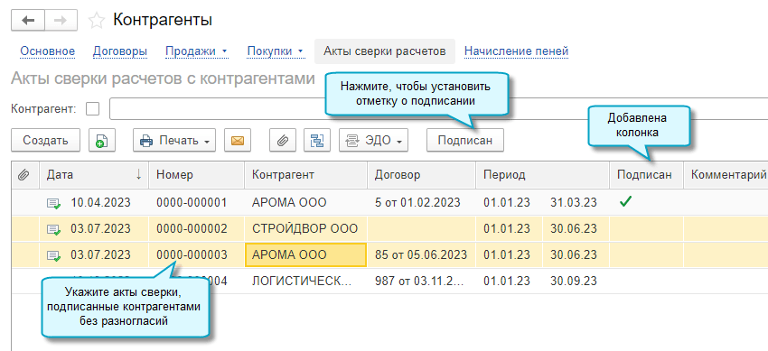 Добавлена возможность устанавливать сразу на нескольких актах сверки расчетов отметки об их подписании контрагентами, не открывая сами акты.