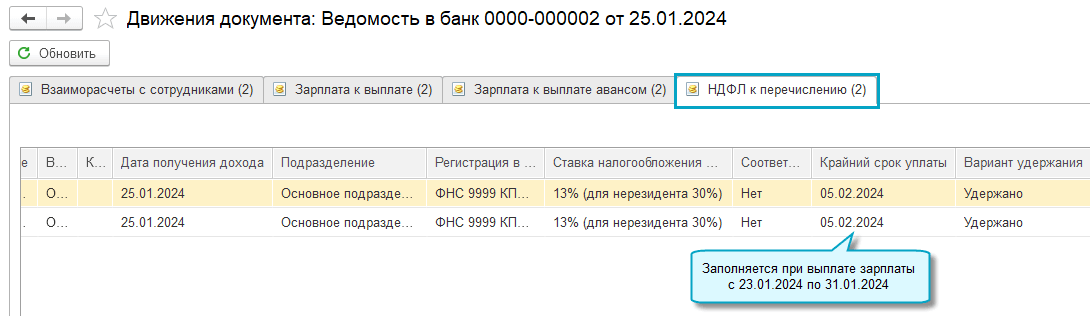 С 01.01.2024 при выплате доходов заполняются два срока для уплаты НДФЛ, удержанного у сотрудников (Федеральный закон от 27.11.2023 № 539-ФЗ).